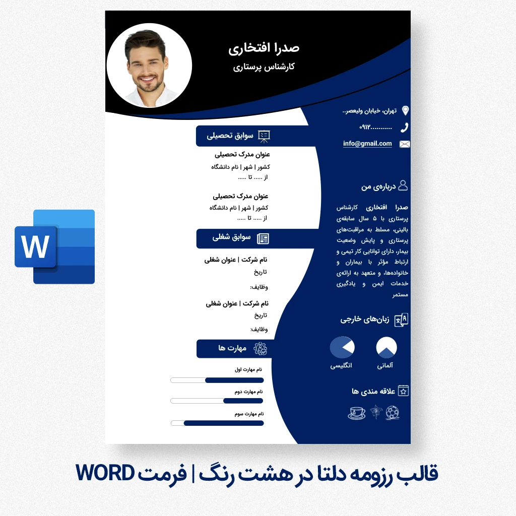 این قالب در فرمت Word ارائه میشود و تمامی بخشهای آن کاملاً قابل ویرایش هستند. شما میتوانید متنها، عناوین، رنگبندی (از میان ۸ رنگ مختلف) و ترتیب بخشها را متناسب با موقعیت شغلی خود تغییر دهید. قالب رزومه دلتا برای کارجویان، فارغالتحصیلان، پرستاران، کارشناسان و افرادی که بهدنبال یک رزومه حرفهای و قابل شخصیسازی هستند، انتخابی کاربردی و آماده استفاده محسوب میشود. اگر مایل هستید سایر قالبهای رزومه حرفهای و قابل ویرایش را مشاهده و مقایسه کنید، میتوانید از صفحه قالب رزومه word در مارکت پلو بازدید کنید.
